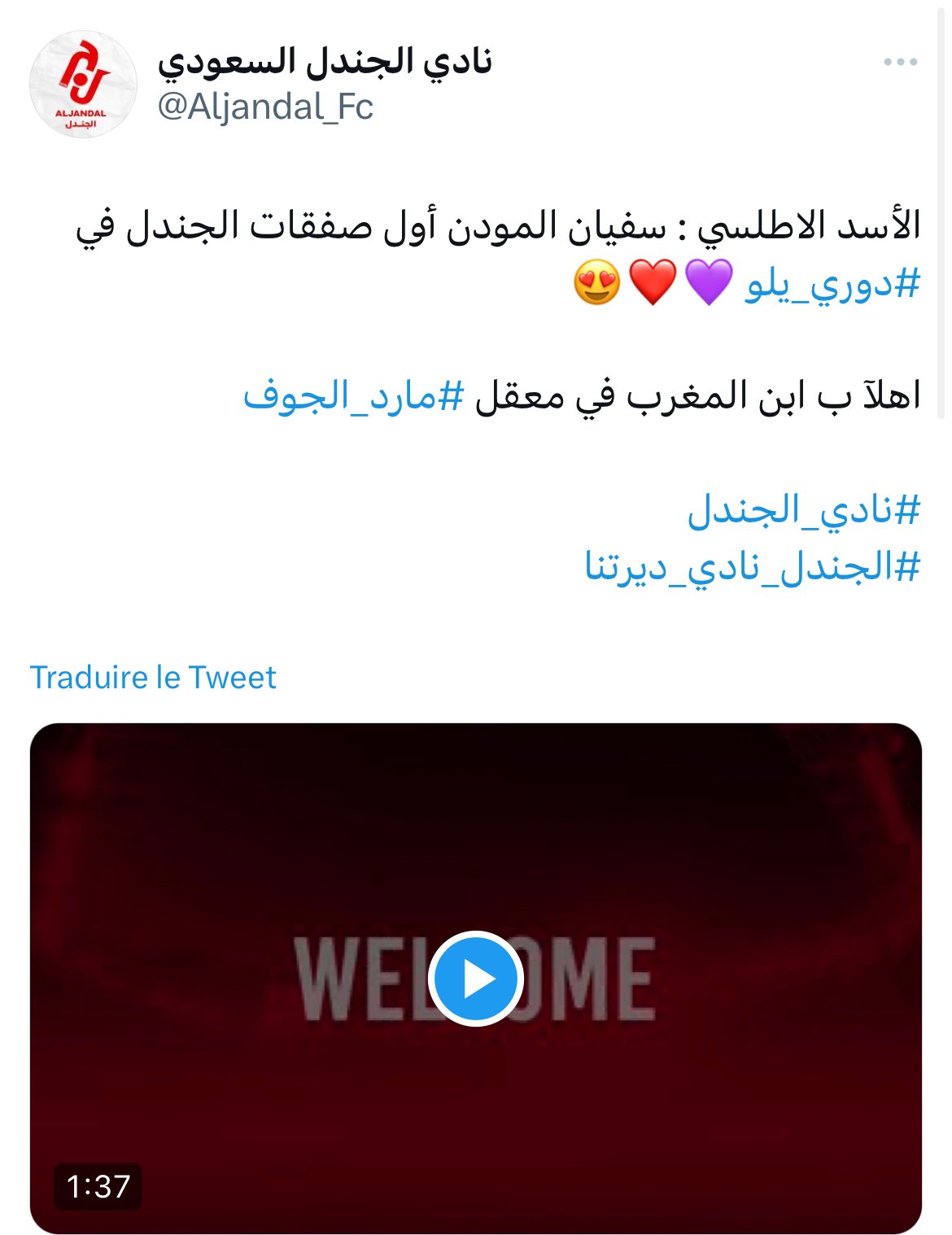 أعلن فريق الجندل السعودي الذي ينشط بالقسم الثاني عن تعاقده مع نجم نادي اتحاد طنجة سفيان المودن في صفقة انتقال حر.