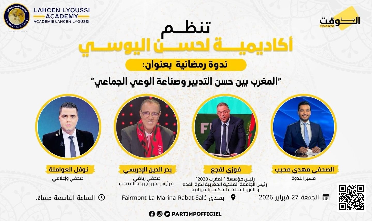 تحتضن العاصمة الإدارية الرباط،يوم الجمعة 27 فبراير 2026،ندوة رمضانية وازنة تنظمها أكاديمية لحسن السوسي تحت عنوان:”المغرب بين حسن التدبير و صناعة الوعي الجماعي”،بمشاركة شخصيات بارزة من عالم السياسة والاقتصاد و الإعلام والرياضة،في لقاء يُرتقب أن يلامس قضايا التدبير العمومي،ورهانات المرحلة،وتحديات بناء وعي جماعي مواكب للتحولات الوطنية الكبرى.