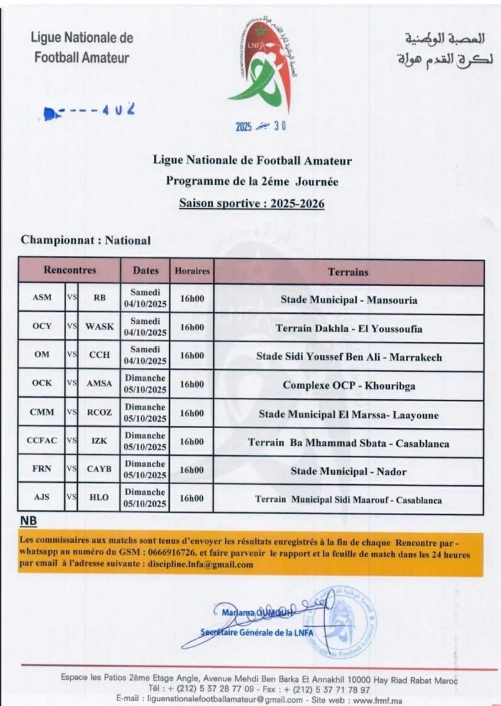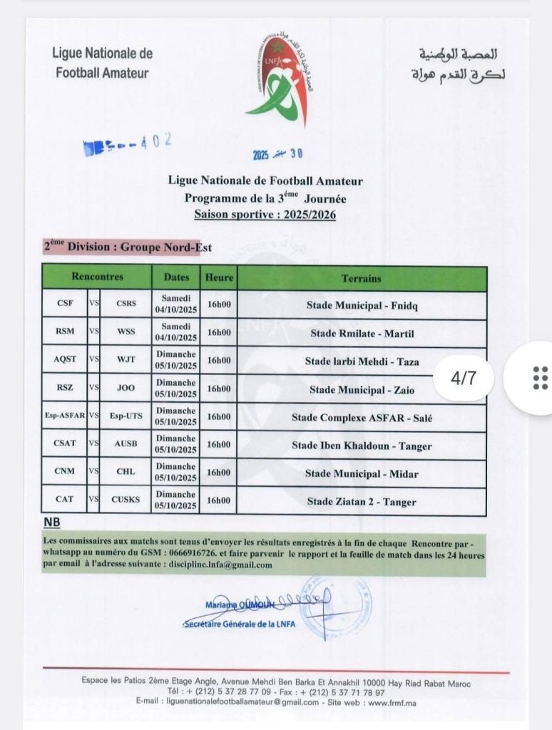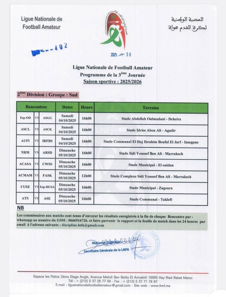 كشفت العصبة الوطنية لكرة القدم هواة ، عن برنامج  الجولة الثالثة من مباريات بطولة الهواة  لهذا الاسبوع ، تهم الحولة الثالثة من بطولة القسم ا الاول هواة شطر الشمال والجنوب ، والقسم الوطني الثاني هواة شطر الشمال الشرقي والشمال الغربي والجنوب  والصحراء، والجولة الثانية من بطولة القسم الوطني هواة ، وستجرى مباريات هذه الجولة ايام السبت والأحد 04-05 أكتوبر 2025