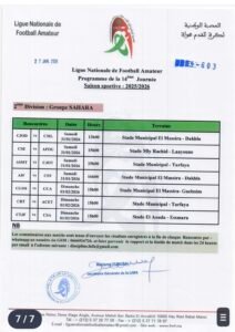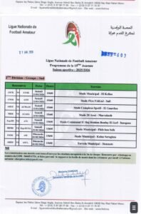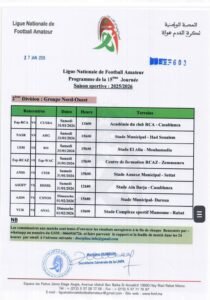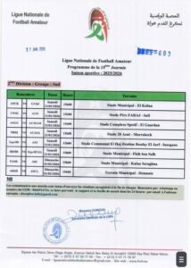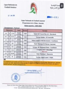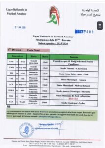 كشفت العصبة الوطنية هواة عن برنامج الجولة 15 من بطولة القسم الوطني هواة، والقسم الأول هواة شطر الشمال والجنوب، والثاني هواة شطر الشمال الشرقي والشمال الغربي والجنوب والجولة 14 شطر الصحراء، وستجرى مباريات هذه الجولة أيام السبت والأحد 31 يناير وفاتح فبراير 2026
