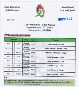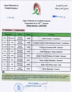 كشفت العصبة الوطنية هواة عن برنامج الجولة 18 من بطولة القسم الوطني هواة،  والقسم الأول هواة شطر الشمال والجنوب، والثاني هواة شطر الشمال الغربي والجنوب  والجولة 17 شطر الشمال الشرقي والصحراء، وستجرى مباريات هذه الجولة أيام السبت والأحد 21 , 22 فبراير الجاري أي