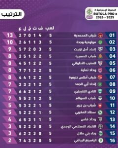 بعد إجراء الجولة الخامسة من بطولة القسم الوطني الثاني، يواصل فريق شباب المحمدية صدارة الترتيب وحيدا بعد فوزه على ضيفه الراسينغ البيضاوي، ويحتل الفريق المركز الأول برصيد 13 نقطة بفارق نقطتين عن مطارده المباشر المولودية الوجدية صاحب المركز الثاني،اتحاد أمل تزنيت يلتحق بالمركز الثالث بعد فوزه على الاتحاد الاسلامي الوجدي، على صعيد أسفل الترتيب،ثلاثة أندية تبقى بدون انتصار ويتعلق الأمر بكل من رجاء بني ملال والإتحاد الإسلامي الوجدي والراسينغ البيضاوي.